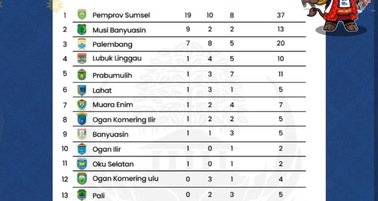 Sementara itu, Lubuk Linggau berada di urutan keempat dengan total 10 medali, dan Prabumulih menyusul di posisi kelima dengan 11 medali. Beberapa kabupaten seperti Musi Rawas, Muratara, Pagaralam, dan Empat Lawang hingga kini belum memperoleh medali.