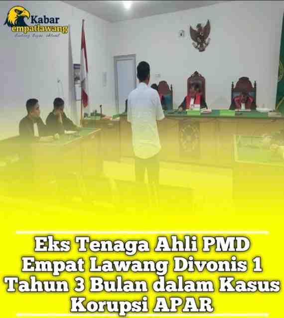EMPAT LAWANG,KABAREMPATLAWANG.C0M– Tenaga Ahli Pemberdayaan Masyarakat Desa (PMD) Empat Lawang, Sumatera Selatan, periode 2021–2023, Bembi Saputra, yang terlibat kasus korupsi pengadaan Alat Pemadam Api Ringan (APAR), divonis 1 tahun 3 bulan penjara oleh Majelis Hakim Tipikor Pengadilan Negeri (PN) Palembang. Atas putusan tersebut, Bembi menyatakan pikir-pikir.